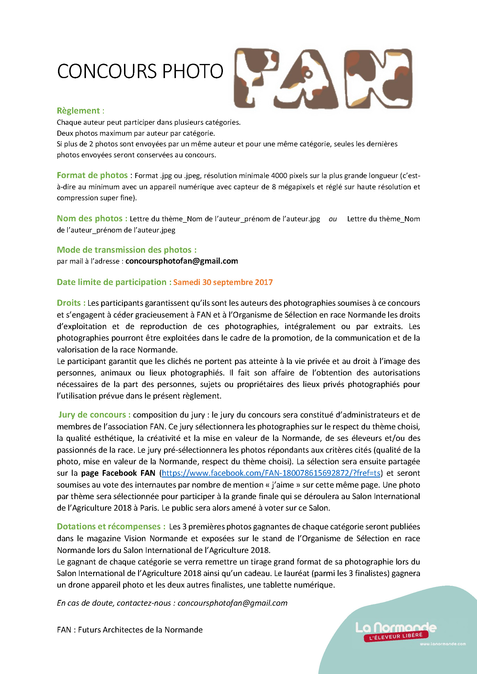 Le Concours inter-régional en race Normande au Sommet de l'élevage aura lieu à Cournon (63) le mercredi 4 octobre 2017 de 9h à 11h. Les éleveurs intéressés doivent s'inscrire avant le 14 août 2017, avec la possibilité de bénéficier d'un hébergement gratuit sur réservation lors de l'inscription.